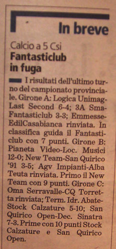 ASTI, Palestra Dalla Chiesa - Nella quinta giornata del girone A FC Fantasticlub perde ancora punti per strada e si fa battere da una Last Second dalle doti tecniche non eccelse ma dalla maggiore convinzione. Nel primo tempo molte le occasioni sprecate dai gialloneri, che anche in superiorità numerica riescono a non segnare, mentre Stella invece la butta dentro. Pochi minuti dopo Last Second pareggia, ma un'ottima diagonale bassa di Squillace mette Chicco in condizioni di battere a porta vuota.